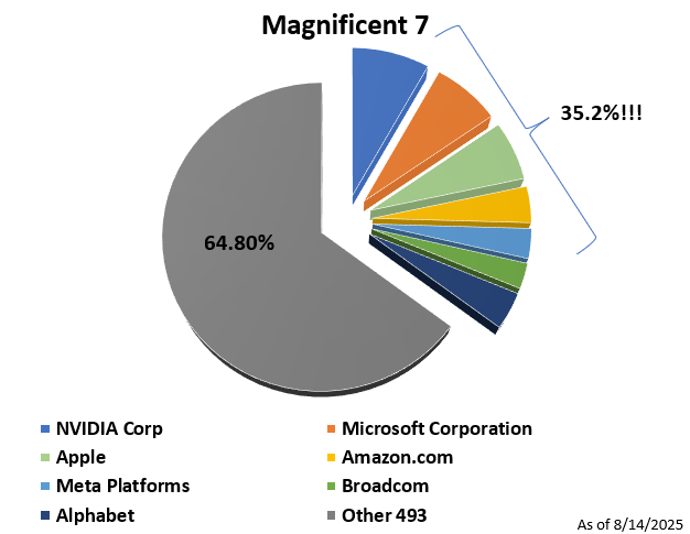 The S&P 500 is market-cap weighted, meaning larger companies exert outsized influence in the S&P 500’s returns. As of August 14, 2025, the S&P 500’s total market capitalization is approximately $54.45 trillion. About a year ago, I showed that the “Magnificent 7” made up 30.88% of the S&P 500. Today, the top 7 names make up 35.2% of the S&P 500! Broadcom replaced Tesla in the top 7, but the others kept their spot.