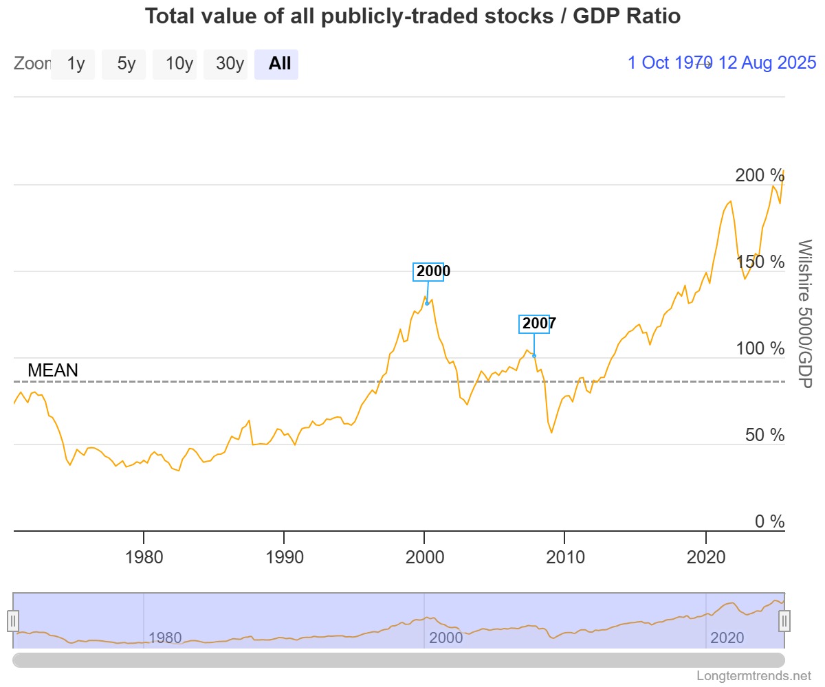 The Buffett Indicator, the ratio of total US stock market capitalization (Wilshire 5000) to US GDP, stands at ~210%. This is the highest reading ever: