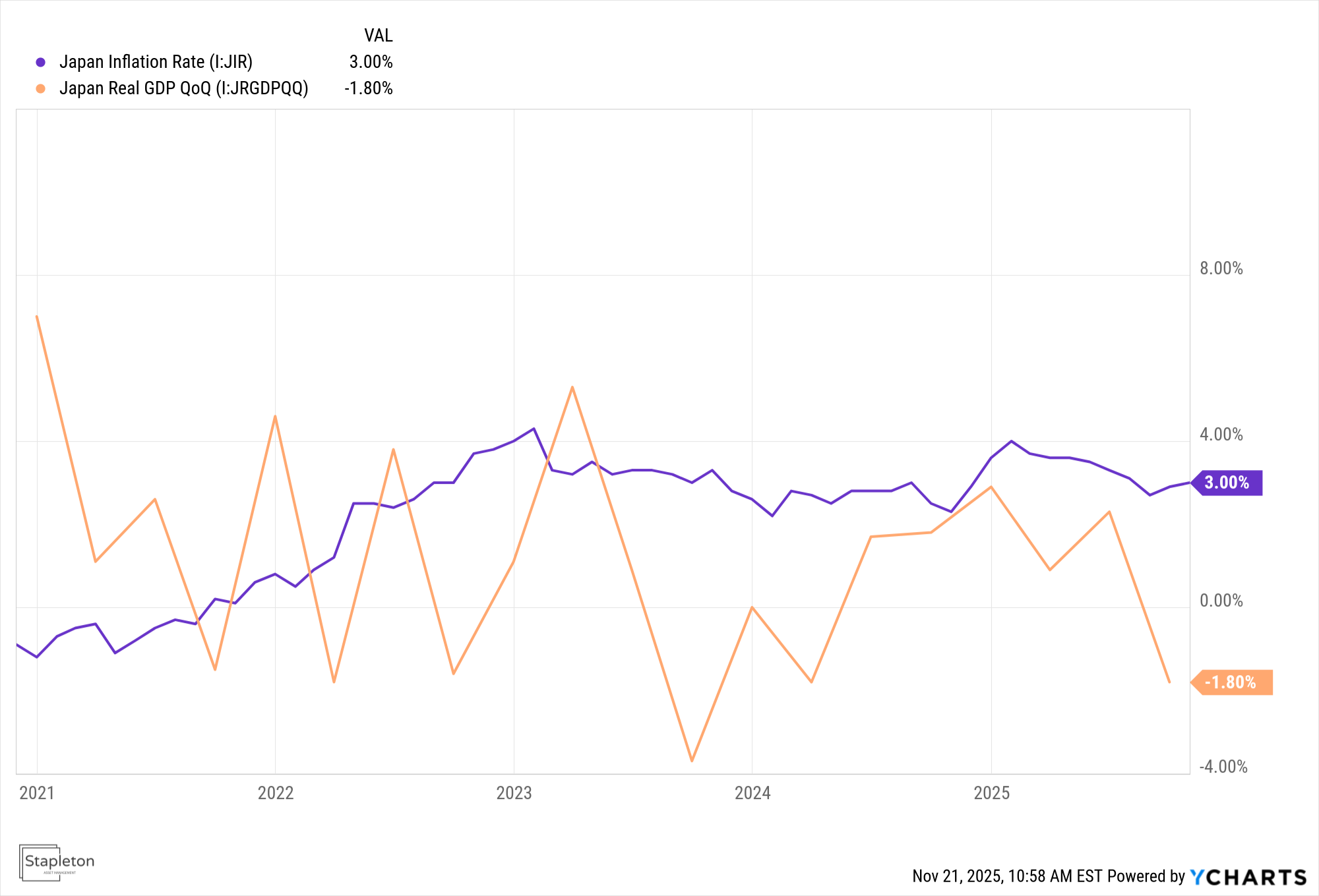The progress in wage growth is under threat from a sharp economic downturn. Real GDP contracted by 1.8% annualized in the third quarter of 2025, the first decline in six quarters and the steepest in over a year, driven by weakening exports amid escalating U.S. tariffs and a plunge in residential investment. In response, pro-stimulus Prime Minister Sanae Takaichi (“Abe 2.0”) is set to unveil Japan’s largest economic package since the pandemic era on Friday, November 21, with ¥17.7 trillion ($112 billion) in spending funded by an extra stimulus budget. This expansive fiscal push is aimed at mitigating inflation’s impact on households and bolstering strategic sectors, defense, and foreign policy. It risks overheating an already strained economy and exacerbating Japan’s debt burden, which the IMF projects at 230% of GDP.
