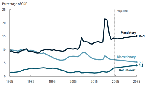 DOGE’s mission to streamline government efficiency is laudable, but its focus on discretionary spending sidesteps the entitlement programs that are growing rapidly in the future. It is projected that Social Security, Healthcare and interest payments would consume 23.3% of US GDP by 2054 and total expenditures would be about 32% of GDP. This is without a rise in interest rates.