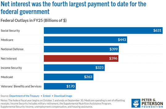 The U.S. faces a narrowing window to act. With 4 million baby boomers retiring annually, delay only deepens the fiscal hole. Stabilizing the debt-to-GDP ratio at 100% is achievable, but truly difficult to imagine given the disfunction of our two-party system. The alternative – inaction – risks a debt crisis that could destabilize the economy, create spiking inflation/interest rates, while causing concern about the US Dollar’s reserve currency status. I have said in the past; I don’t have a strong belief that politicians will react prudently with large needed changes until we hit that crisis point.